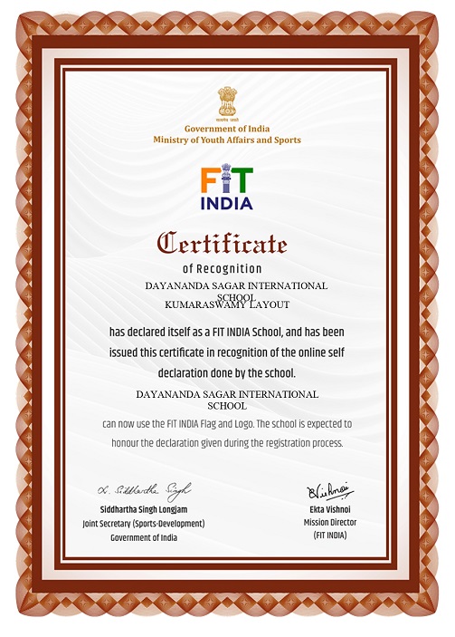 It's a pleasure to inform that Dayananda Sagar International school has been certified as one of the Fit India school by Fit India sports association