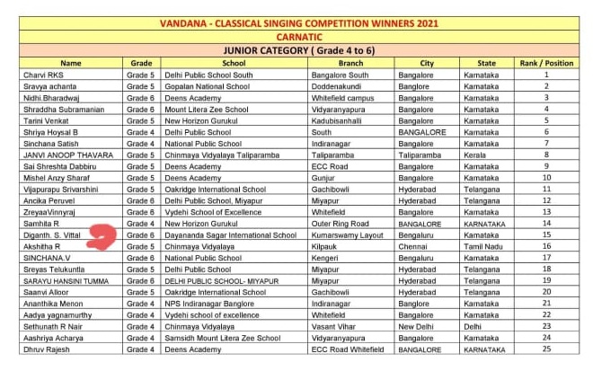 We are happy to share that Miss. Sharadhi of Grade VI got selected to the State Level Singing Competition by securing second place at DivisionLevel Competition held at Kala Prathibhotsava . We congratulate her and wish her for the State level competition.