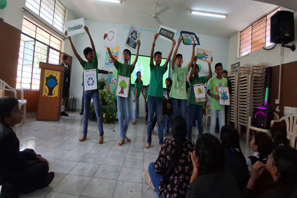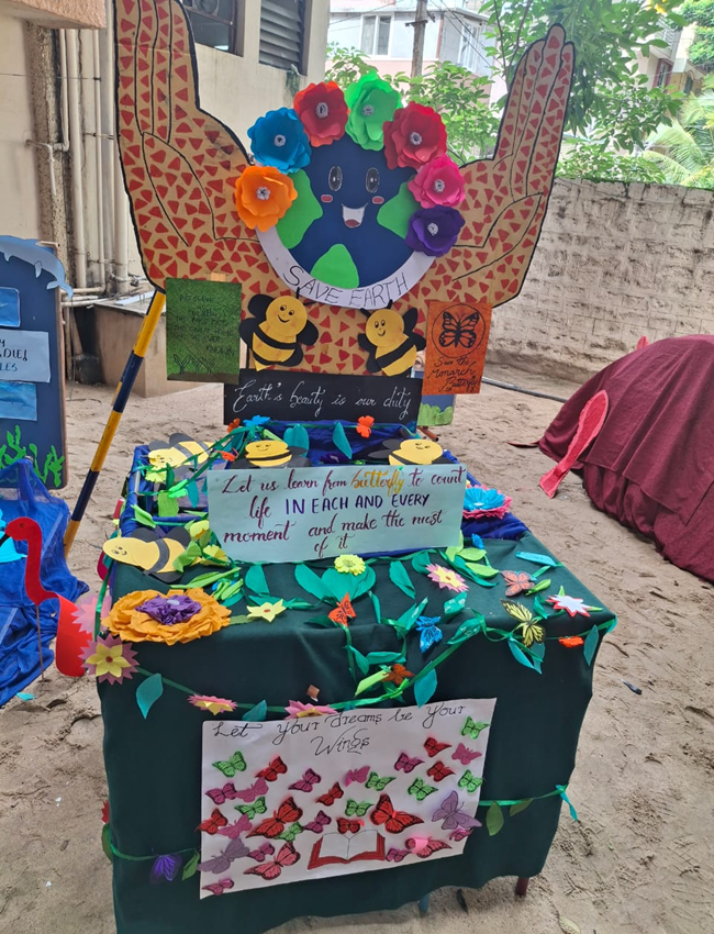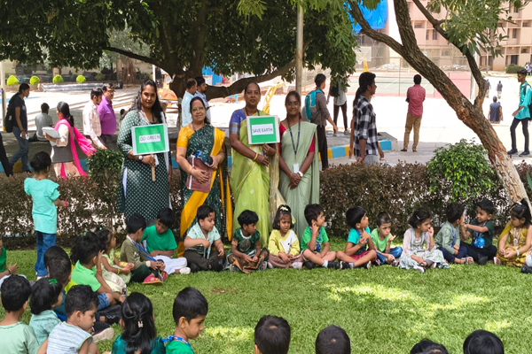 Started with nature walk in campus, showing green plants and trees, children were dressed up in green. Students enjoyed green objects and charts showcased by the teachers'.